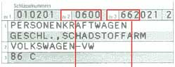 Die KBA-Nr. steht unter der Bezeichnung "Schlüsselnummer zu 2." und "Schlüsselnummer zu 3." in Ihrer Zulassung. (KBA=Schlüsselnummer)